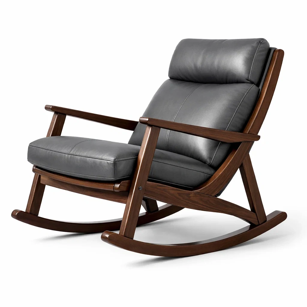 Sedia a dondolo in legno di noce con ecopelle grigia